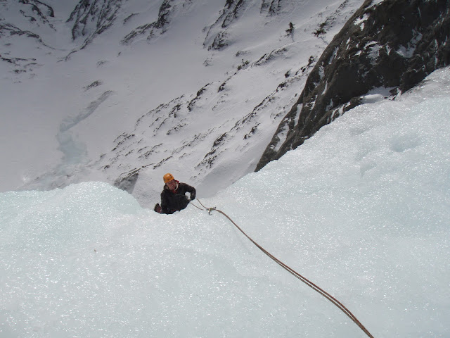 After surveying the chosen line from the climbers above, I rationally opted for an ice fall free line on the climbers right of the frozen falls. This turned out to be a wise, experienced decision due to the unavoidable firing of shrapnel by the lead climber above which every ice climber has experienced. Wisely I was tucked over on the right hand side of the climb avoiding any friendly fire, and just enjoying the freedom of moving unroped through this terrain, but remaining focused about the seriousness of the endeavor I had chosen to